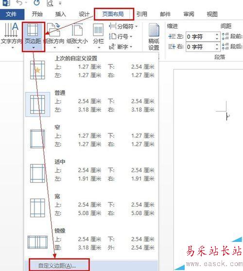 2、單擊“頁面布局”,在單擊“頁邊距”,選擇“自定義邊距”。