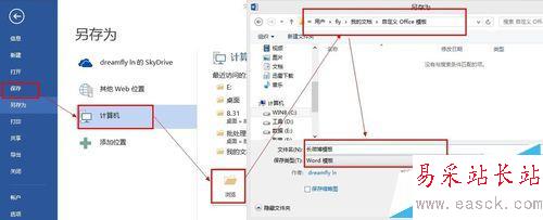 6、保存為模板:單擊“保存”-》“計(jì)算機(jī)”-》“瀏覽”-》“C:/Users/fly/Documents/自定義 Office 模板”(fly為當(dāng)前用戶名,這為Win8環(huán)境下Office模板的位置,其他版本類似【有的版本Office用戶模板路徑為C:/Documents and Settings/<用戶名>/Application Data/Microsoft/Templates】),然后命好模板的文件名(這里可以命名為“長微博模板”),保存類型選擇“word模板”,最后單擊“保存”即可。
