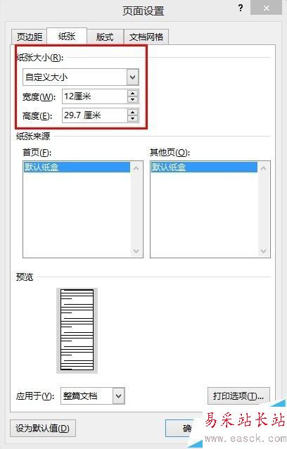 4、切換到“紙張”選項(xiàng)卡,設(shè)置紙張的大小:“紙張大小”選擇“自定義大小”,寬度可以選擇12厘米(一般長微博寬度在12厘米左右),高度可以不先設(shè)置,因?yàn)殚L微博圖片不一樣長。
