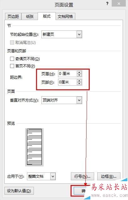 5、切換到“版式”選項(xiàng)卡,設(shè)置頁眉頁腳距邊界的距離,這里都設(shè)置成0就可以。終于完成了頁面設(shè)置,單擊“確定”即可。