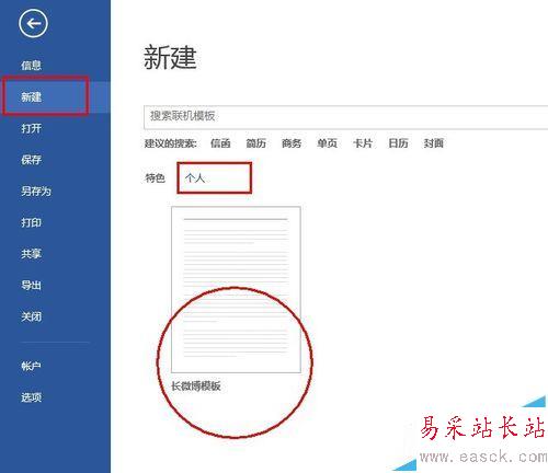 7、關(guān)閉Word后,在打開Word,單擊“新建”選擇“個人”(一些Word版本可能不同,只要選擇從模板中新建即可),單擊“長微博模板”即可打開,然后就可以進(jìn)行編輯了。