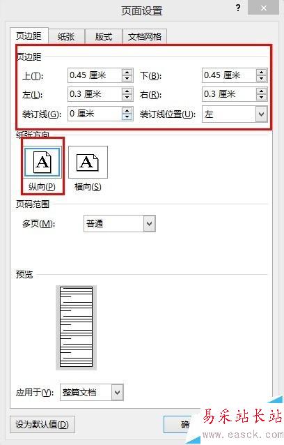 3、設(shè)置頁邊距:上下左右設(shè)置較小的數(shù)值,推薦不超過0.5厘米,這里我選擇的上和下為0.45厘米,左和右為0.3厘米,如下所示。紙張方向默認(rèn)“縱向”就可以,不用更改。