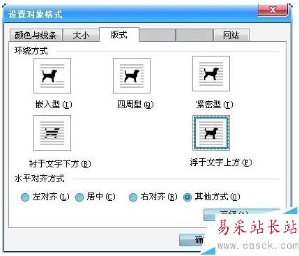 二、選擇“版式”中的“浮于文字上方”,點擊確定