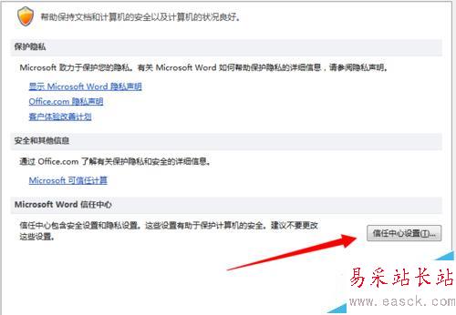 4、進(jìn)入信任中心界面,點(diǎn)擊右方【信任中心設(shè)置】