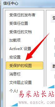 5、在信任中心,找到【受保護(hù)的視圖】選項(xiàng),這個(gè)就是問(wèn)題所在