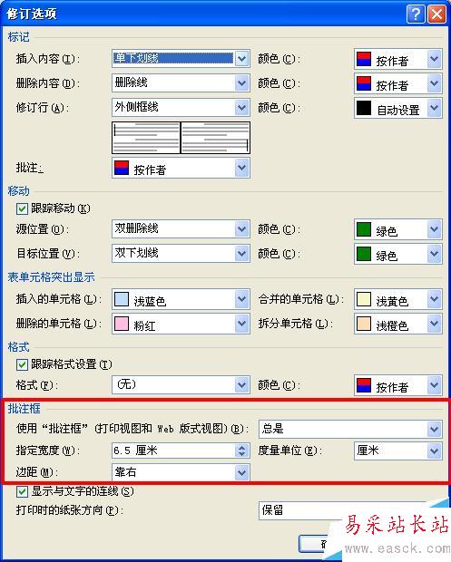3、在彈出的“修訂選項”設(shè)置框中,找到“批注框”,如下圖所示: