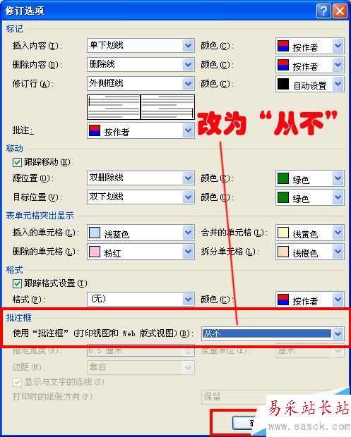 4、在“使用批注框”選項后面選擇“從不”,并點擊“確定”,如下圖所示: