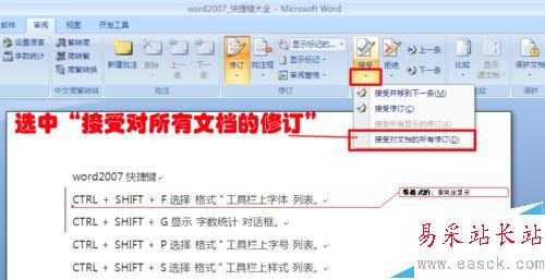 5、然后工具欄“審閱”中,找到“接受”欄,點擊下方的小箭頭,出現(xiàn)下拉菜單,選中“接受對所有文檔的修訂”,如下圖所示: