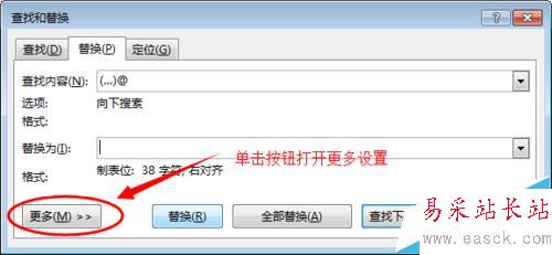3、按快捷鍵Ctrl+H打開對話框【查找和替換】,鼠標點擊【查找內容】文本框,輸入 (...)@ ,然后鼠標點擊【替換為】文本框,再單擊下面的【格式】按鈕。如果沒有顯示格式按鈕,可以點擊 【更多】打開。