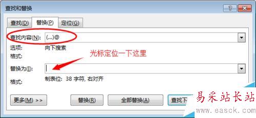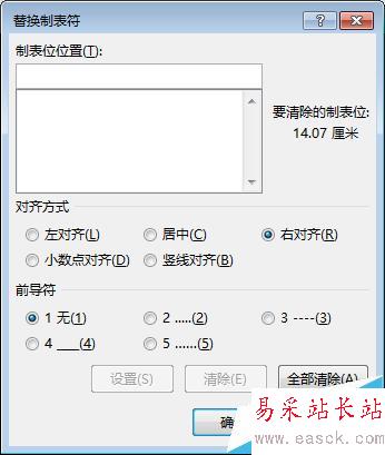 4、在【格式】下拉菜單中選擇 制表位 選項,彈出替換制表符對話框,在【制表位位置】輸入38(數值可以根據自己需要調整大?。?;【對齊方式】選擇右對齊;【前導符】選擇5【......】,然后單擊設置按鈕,并點擊確定關閉對話框。