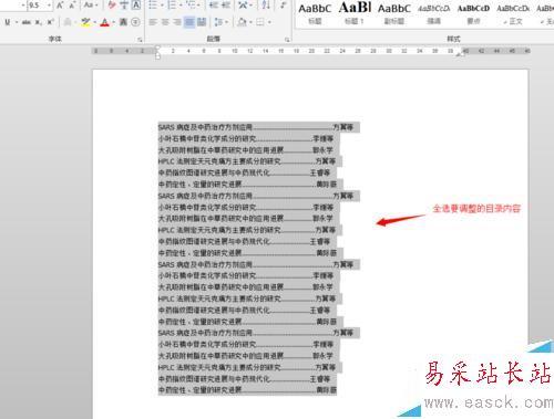 2、下面小編開始解決。首先選中要調整的目錄內容,可以用鼠標框選,也可以使用快捷鍵Ctrl+A選中全部內容。