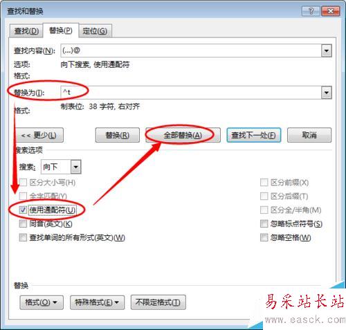 5、回到【查找和替換】窗口,在【替換為】文本框中輸入 ^t ,單擊下面【使用通配符】前的復選框打鉤,最后單擊 【全部替換】按鈕。這時如果彈出對話框,詢問是否替換其他位置,可以根據需要選擇 是 或者 否。