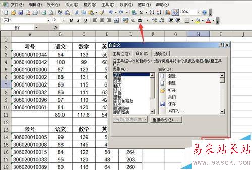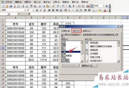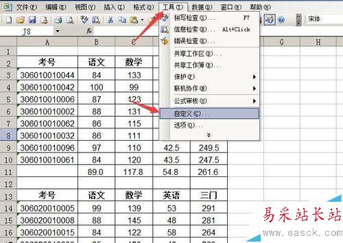 1、打開一個需要復制部分數據到其他文檔中的Excel表格,依次點擊 工具→自定義,進入自定義對話框。如圖