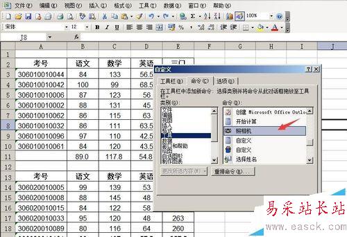 3、鼠標左鍵點選照相機功能后,按住鼠標左鍵不放,將其拖到格式欄中,然后關閉自定義對話框,相機功能就添加了。如圖
