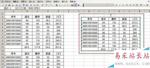 4、在Excel中,按住鼠標左鍵不放,從左上角到右下角(↘)選中需要復制的區域,然后在格式欄單擊照相機圖標,回到Excel中,在空白處單擊鼠標左鍵,即可“拍攝”出一張所選區域的圖片。如圖