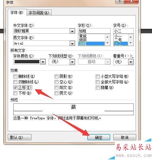 5、在字體選項(xiàng)框中,選擇上標(biāo)后,點(diǎn)擊確定。