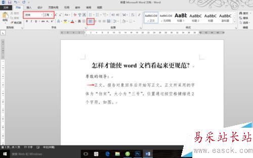 開頭回車后開始寫正文,正文所采用的字體為“仿宋”,大小為“三號(hào)”,位置通過按空格鍵縮進(jìn)2個(gè)字符,如圖。