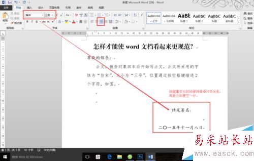 5、結(jié)尾署名所用字體為“楷體”,大小為“三號(hào)”,位置為“右對(duì)齊”,結(jié)尾署名與時(shí)間之間要空一行,且兩者要保持居中對(duì)齊關(guān)系,如圖。