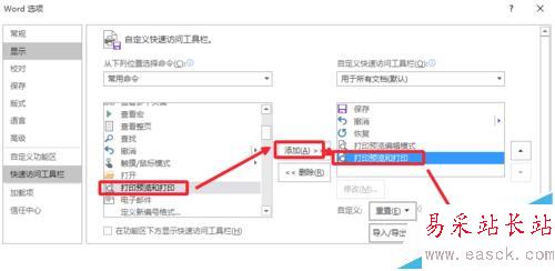 6、將需要的打印按鈕添加進來到自定義快速訪問工具欄。