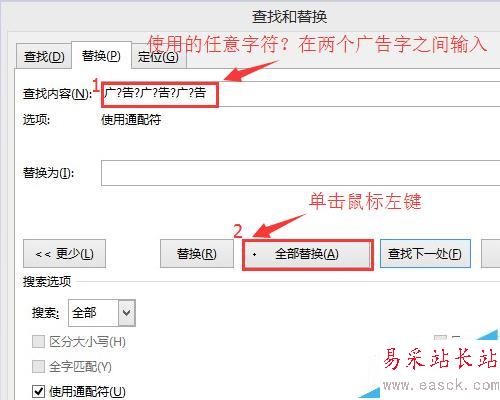 5、接著用“任意字符?”在兩個廣告字之間輸入,例如:廣?告?廣?告?廣?告,最后單擊全部替換,如下圖所示: