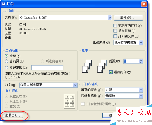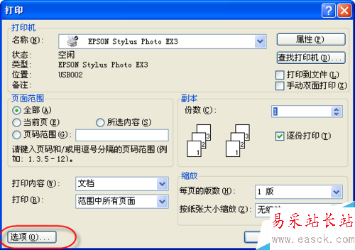 2.在”打印“窗口中點擊”選項“按鈕。如圖所示。
