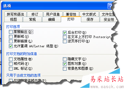 5.在“選項”窗口中,在”打印文檔的附加信息”下勾選“隱藏文字”。最后點擊“確定”按鈕就可以。