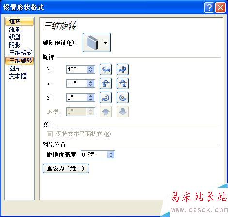 6、在【三維旋轉(zhuǎn)】選項卡中可以有更多更詳細地設置三維旋轉(zhuǎn)。