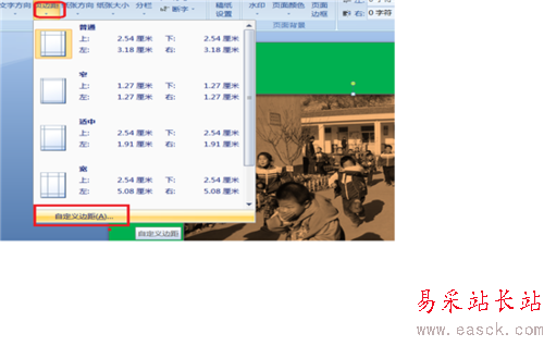 6、如果感覺插入的圖片比較靠上的話,可以進行頁邊距的設置,在工具欄中找到頁面布局,找到頁邊距,單擊一下,找到自定義,再單擊一下,把頁邊距的上方設置的數值大一些就可以了。