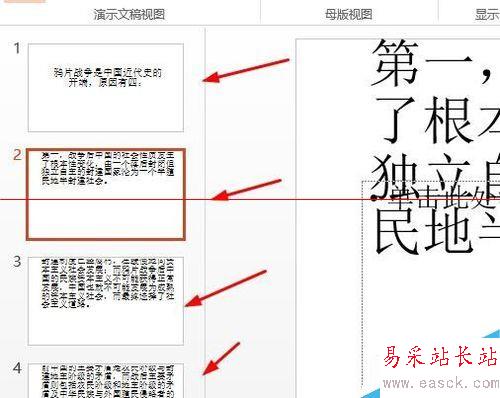 6、然后再點擊“大綱視圖”旁邊的那個選項,即“普通”,就回到正常編輯幻燈片的頁面了,然后即可以根據(jù)你的要求在每一頁去設(shè)置文字的格式。