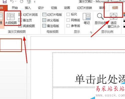 3、在PPT的空白演示文稿的最上面的工具欄中,選擇“視圖”,然后再點擊子菜單中的順數(shù)第二個選項,“大綱視圖”。
