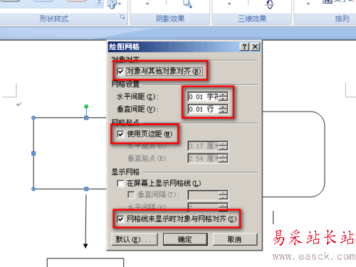 3、在打開的“繪圖網格”窗口中,選中“對象與其他對象對齊”、“網絡線未顯示時對象與網格對齊”這兩個選項。在“網格設置”中將“水平間距”和“垂直間距”的數值設為最小值0.01。點“默認”,從這以后打開的文檔使用的都是這個設置。然后,確定,設置完成。