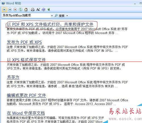 2、在彈出的word幫助菜單中,搜索”另存為pdf或xps加載項“,得出如圖所示的結(jié)果,圖中的第一個選項正是我們需要的。點擊它。