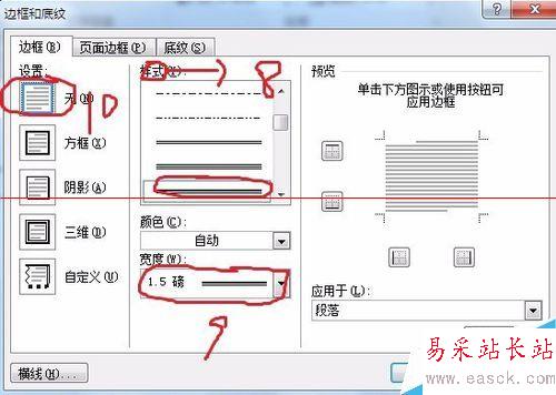5、然后在樣式里面選擇上粗下細的。找到之后選中。然后寬度選擇1.5磅。邊框設置為無