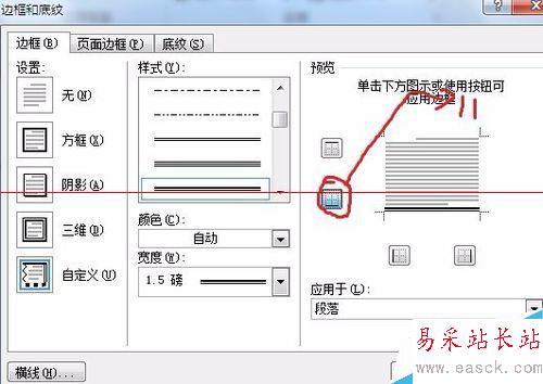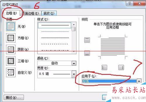 4、進入邊框和底紋選項卡。選擇,邊框。在點擊右下角應用于段落