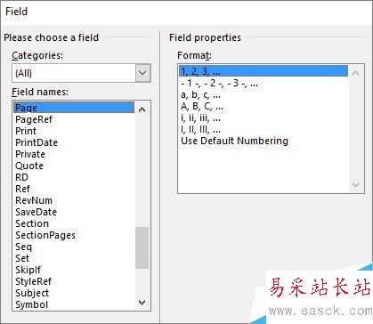 4. 在字段名稱列表中,選擇頁面上,并在字段屬性下選擇所需的編號格式,然后選擇確定。