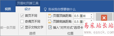 1. 雙擊頁眉 (頁的頂部) 區域或頁腳 (頁的底部) 區域打開在頁眉和頁腳工具下的設計選項卡中。