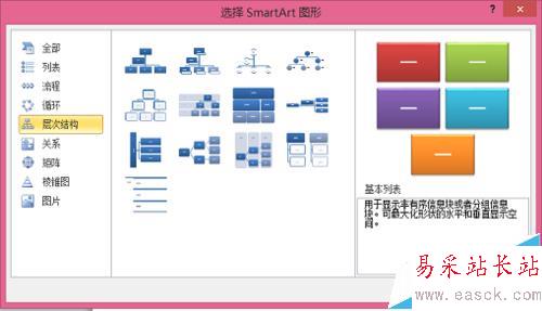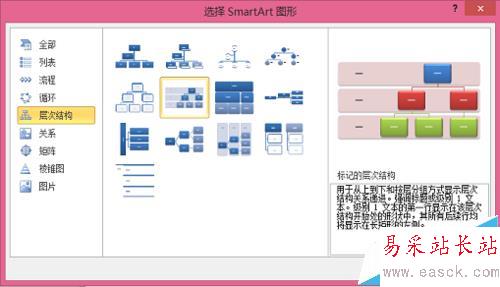 2、電腦會彈出選擇smartart圖形窗口,選擇層次結構,注意題中的細節,選擇“標記的層次結構圖”。(層次結構圖包含很多種)
