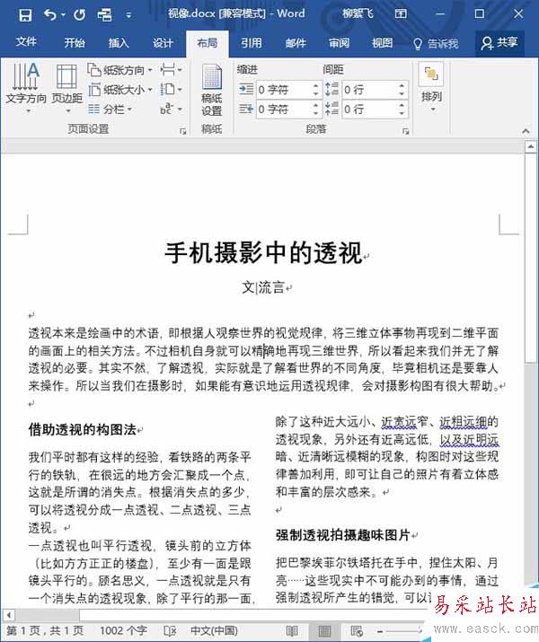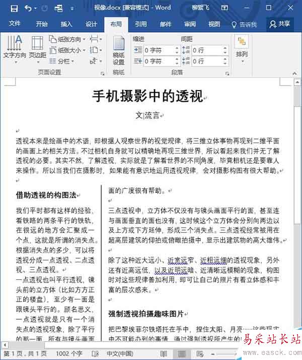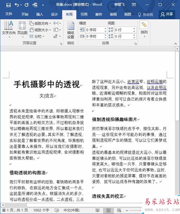 從下拉菜單中選擇“兩欄”后,可以看到整個文檔已經自動分欄了,版面美觀了很多。而且在本例中,本來顯示為共2頁,現在版面壓縮成了1頁。