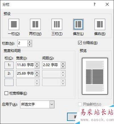 除了兩欄外,我們還可以選擇三欄、偏左、偏右等選項。點擊分欄下拉菜單中的“更多分欄”,在打開的分欄對話框中,我們還可以對分欄進行更精細的調整。在這里,可以設置欄間距的大小,可以設置左右分欄的各自大小,勾選“分隔線”還可以添加欄間線。