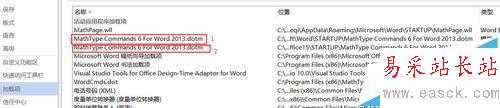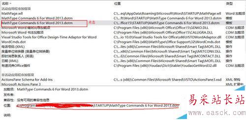 4、這時候,你需要查看右邊的“名稱”,“位置”,“類型”,自己找到相同的兩個名稱選項,如下圖,我們可以找到有兩個“MathType Commands 6 For Word 2013”的加載項。