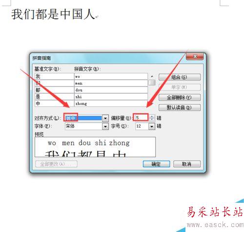 7、拼音輸入完成后,找到對齊方式選項,將其調(diào)節(jié)為居中對齊,在偏移量里調(diào)節(jié)偏移量的值為5,如圖所示: