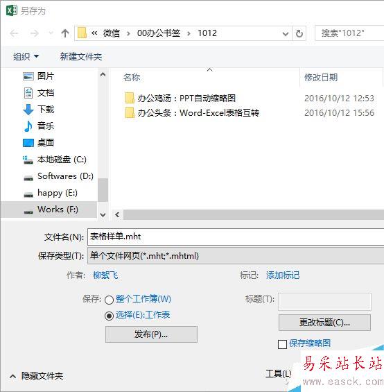 在打開的另存對話框中,選擇保存類型為“單個文件網頁(*.mht;*.mhtml)”,并在下面點選“選擇(E):工作表”。