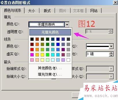 雙擊圖形,彈出的操作框中,在“填充顏色”右側(cè)的小三角形中點(diǎn)下,彈出的菜單中點(diǎn)“無(wú)填充顏色”;