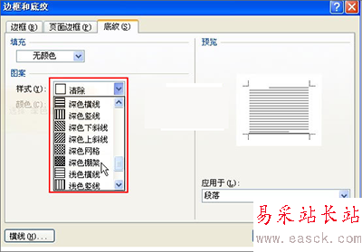 2、彈出邊框和底紋對話框,切換到底紋標簽,單擊圖案--樣式后的小三角箭頭,從下拉菜單中選擇底紋樣式,這里小編選的是“深色棚架”;