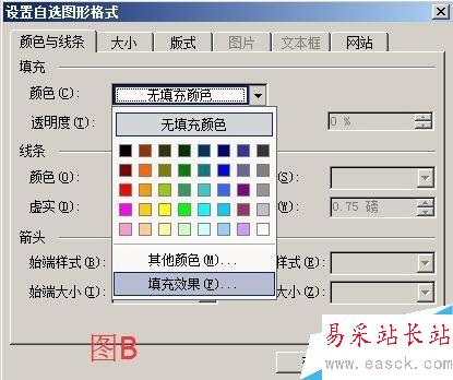 在“填充顏色”右側的小三角形點下,彈出的菜單中點“填充效果”;