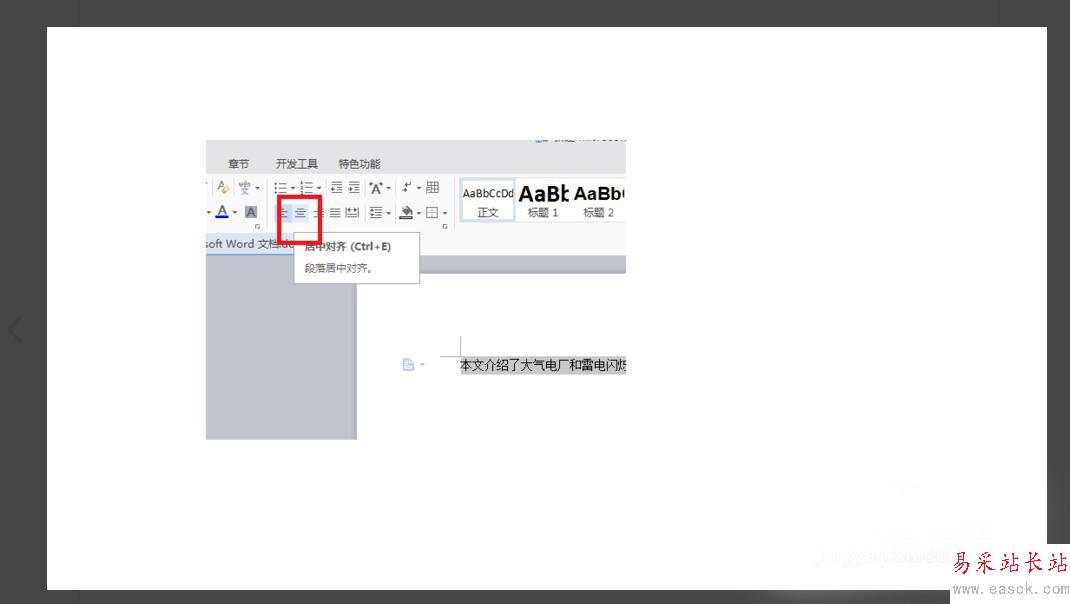5、點擊“居中”,你會看到這時這段文字就居中了