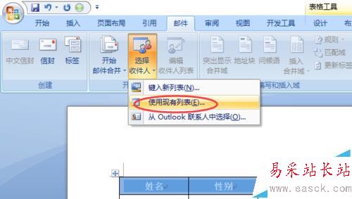 4、然后在開始郵件合并按鈕右側的選擇收件人按鈕,在其下面的使用現有列表按鈕。