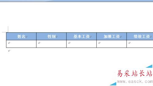 2、打開word,制作我們的工資條。表頭與excel中的一致。這里將表頭進行了設置,底紋設置成藍色,字體設置成白色,并且水平居中、垂直居中。這些設置比較簡單。