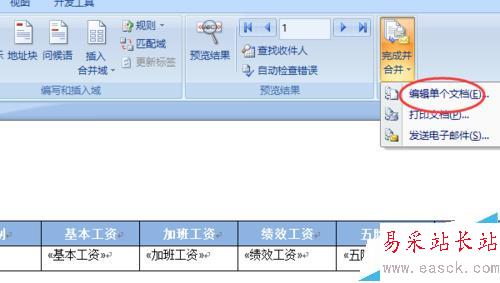 8、現在的工作已經接近完成了,只需要將數據填充進來,在郵件選項卡,單擊完成并合并下面的編輯單個文檔按鈕。