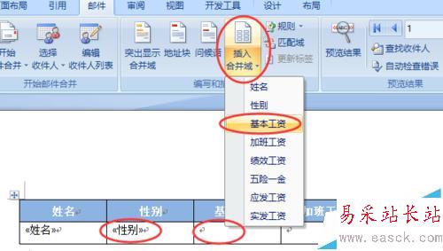 7、確定之后,仍然是在郵件選項卡,找到編寫和插入域下面的插入合并域按鈕。將域按照名稱插入我word表格相應的位置。